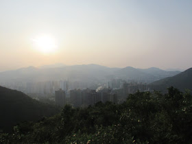 在叢林中穿插約半小時,終到麥徑四段石芽背附近,那裡有支路落花心坑。朝著往花心坑的山徑下走,到達一處明顯的路口,棄大路繞小路落花心坑,途中可下望沙田河畔及小瀝源一帶之風景,可惜是日霧霾實在太重了,那裡雖然沒有引路帶,不過路況還算明顯的,約半小時步程到花心坑,再落大輋村、黃泥頭,經馬路出石門站完成半天行程。