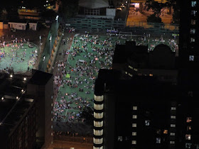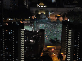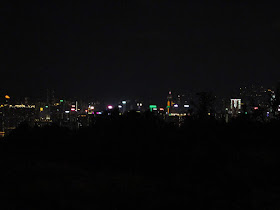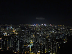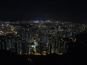 上山樓梯起碼有五百級,走了十分鐘抵達約420米高的「觀景台」,那裡有道長長的石堤,前無阻隔,自然是一處絕佳的觀景地點,當時正有一群遊人賞月、玩燈籠。晚上已不能分辨山下的樓宇屬何區,但倒是可見觀塘佐敦谷山及石硤尾主教山,至於下面的慈雲山中央遊樂場就滿佈慶祝中秋的遊人,往大老山隧道口的馬路正堵車(註:中秋節傍晚至晚上很多地方都會堵車),而對岸維港商廈群的外牆燈光則更為精彩,包括中環中心變幻的霓虹燈、信德中心玻璃幕牆上的「團圓」字樣等。