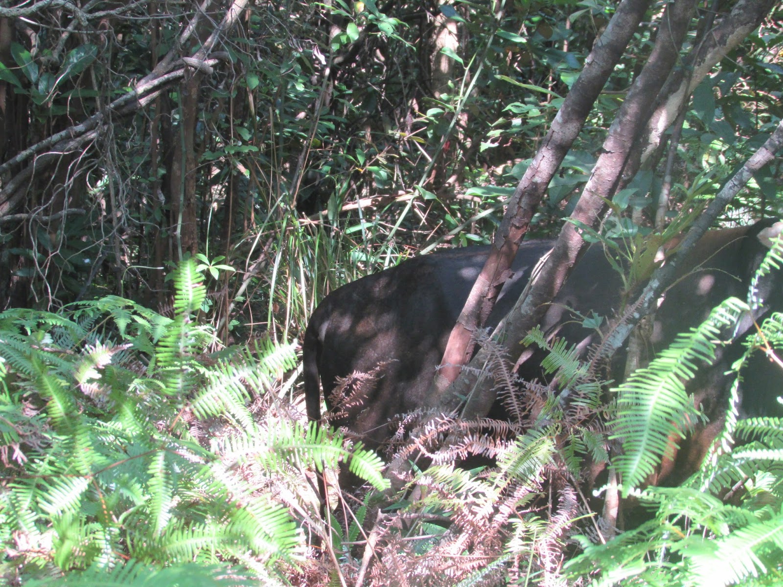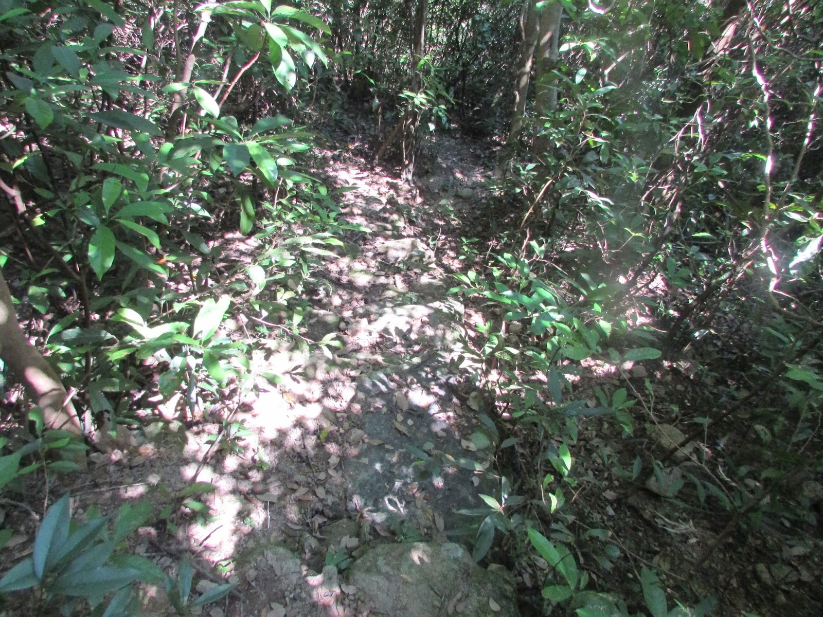 上抵尖光峒坳,再續古道落鎖羅盆,雖然還是身處「野豬林」中,不過已較剛才好走了。草叢中忽然傳來一陣怪聲,原來是一頭牛,難怪地上亦見一些牛屎,那裡的牛群分佈較為零散,連紅石門都有其蹤,不過多數在近海邊或村落活動,很少走到山上。繼續朝古道徐徐下降,廿分鐘後到鎖羅盆村尾的廢田。