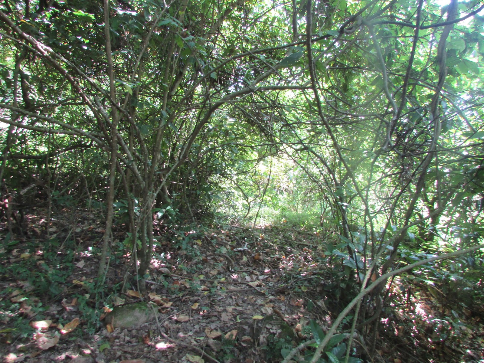 近正午從鹿頸出發,一口氣沿海邊村徑經鳳坑往谷埔,先在谷埔村的士多吃餐蛋麵後才上路。取道「鎖谷古道」往鎖羅盆,古道入口在村東面其中一處隱蔽角落,先穿過小廢田才上山。古道似乎不多人走過,只有又少又殘舊的引路帶,且雨季剛過,植物長得很茂盛。在田中找了很久,幾近放棄之際,發現有小徑似乎可通,惜被小塌樹所阻,把塌樹用力的撥開才可通行。古道環境日漸荒蕪,樹藤及塌樹頗多,較去年同月到訪時更為難行,不時要挪動身體,遷就環境而行,之後穿過溪流急上尖光峒坳,那裡盡被野豬破壞過,連梯級也被搗得殘殘破破的。