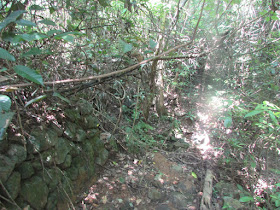上抵尖光峒坳,再續古道落鎖羅盆,雖然還是身處「野豬林」中,不過已較剛才好走了。草叢中忽然傳來一陣怪聲,原來是一頭牛,難怪地上亦見一些牛屎,那裡的牛群分佈較為零散,連紅石門都有其蹤,不過多數在近海邊或村落活動,很少走到山上。繼續朝古道徐徐下降,廿分鐘後到鎖羅盆村尾的廢田。