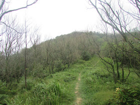 在廟外休息十分鐘就上牛潭坳,雞公嶺是玩越野電單車的熱點,所以上山時也要留意越野電單車,說口未完,上面已有一些電單車下山。在牛潭坳接軍車路繼續上行至牛潭峒路口,此時雙腿已有少許抽搐感覺,只能慢慢走,直至路面再趨於下降為止。憑著記憶,在小脊處下牛潭尾,誰知入口已被野草封閉,今年的草木似乎長得很茂密,去年相約時間還能走通的路段,今年已變得難以通行,包括前星期走過的谷埔至尖光峒坳及牛屎湖山,及再前一星期走過的曹公潭荒廢寮屋區。