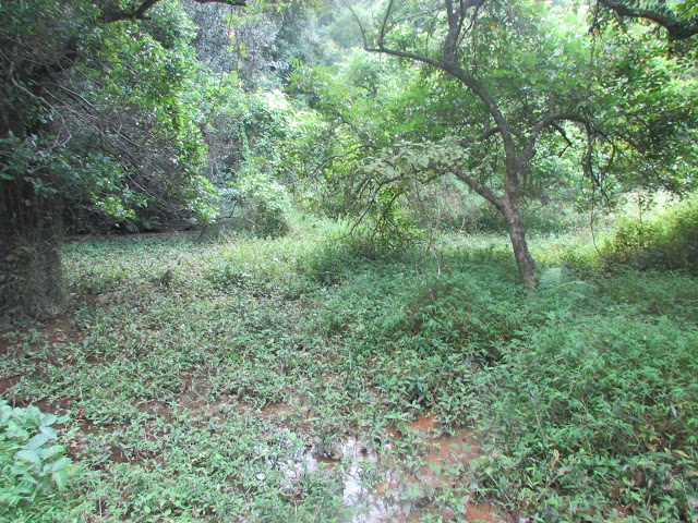 接郊遊徑再上烏蛟騰山火瞭望台,之後轉落亞媽笏附近的路口,先朝「荔枝窩」方向走小段,再在指示牌後隱蔽沼澤路轉入亞媽笏廢村(原有入村的水泥徑已被藤蔓封閉,經亞媽笏的大路實際只是村前的廢田步道),內裡還保留著一排約四座廢屋,全部已破。另外,在亞媽笏村附近同樣有隱蔽水泥路朝西北方而下,還有一些看似較新的引路帶,不過走了一小段都被枯樹覆蓋,可惜林裡陰暗且為時不早,要日後才有機會再探。探過廢村後,朝原路接郊遊徑落烏蛟騰,兩小時行程在此完結,下山時在樹林裡聽到澗道對面近處有赤麂叫聲,想起之前有遠足人懷疑遇上虎蹤,實際可能是赤麂或野豬,因為沿途亦見相當多的野豬痕跡。