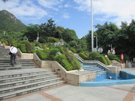 「百步梯」風景區離飛來湖公園約十分鐘車程,在高處可鳥瞰清遠市區的風光,那裡梯級肯定不止一百級,從馬路起計,至「遠眺」字跡的下段最高點約三百五十級,旁邊還有一段登山樓梯直上涼亭,不過時間不足,走了八百級還未到涼亭,只好放棄,此時已上升了約130米,涼亭高度約150米左右,攝過幾張鳥瞰相後,又經樓梯極速下馬路,剛好準時上車 。