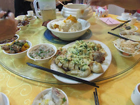 之後在一家相當有文革氣息的餐廳用中餐,那裡在去年尾連州之旅最後一天都到過,但當時吃大盤魚,而是日則是「十八式」,即配以十八道地道小菜,白飯還混合了南瓜。一點十分上車,三點半在麻涌停靠,五點半福田口岸散隊,兩天的英西峰林及百步梯之旅到此完結。