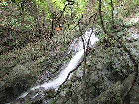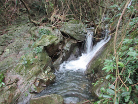 步經護土牆,很快繞入伯公坳的內彎澗道,連場大雨後水量充盈,附近岩面還有濕滑青苔,更要下降一座小岩壁,必須加倍小心。過了內彎就經網邊直往新桂田左坑附近的「左昭右穆」大墳,四年前因山上忽然大霧,結果誤闖新桂田,再摸黑經圍網邊往沙頭角,那段圍網邊其實只是當日的三分一路程。
