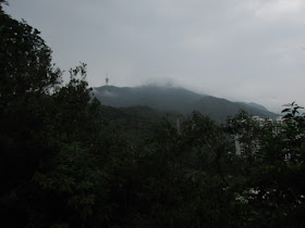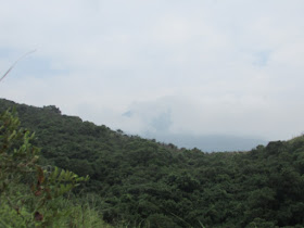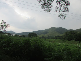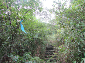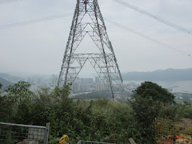 十一點半在擔水坑起步,在村裡轉左,一邊上山一邊穿過群村後的墳區,那裡本來是一大片梯田,不過因梯田荒廢,且背山(紅花嶺山脊線)面水(沙頭角海),無疑變成原居民先人的葬身之地了。山徑轉為崎嶇及斜度增加,半小時後到電塔底,是日濕度高,所以要在電塔底稍休,並回望沙頭角一帶的風光。電塔底正進行工程,工人甚至走上二百餘米崎嶇山路,放下多支大蒸餾水讓他們補充水份,真是辛苦了。休後轉入林中,之後是一段窄如棧道的橫山路,下面已是直直泥坡,且腳下的泥土仍是濕滑,行進時要非常謹慎。