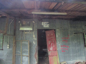新桂田的荒廢鐵皮屋,屋前有爐灶、豬圈: