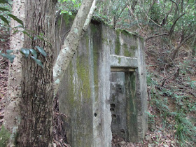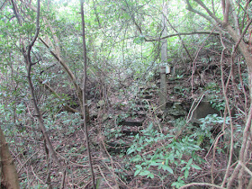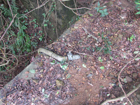 穿過上瞭望台的明顯小徑,之後經一段橫山徑微上往伯公坳麥景陶碉堡,這已是全日較好走的一段。對上一次到伯公坳碉堡時正是年初近六十年來最寒冷的一天,事隔九個月,碉堡左邊已有很多引路帶,真是意想不到,相信蓮麻坑村的解禁吸引大量遠足隊到礦洞附近尋幽。引路帶引至一片水管斜坡,斜度較高且雨後泥濘相當滑腳,連站都站不穩,有樹扶樹,細步找安全落腳點而下,盡量不要玩滑梯,途經一個泵房,半小時後直落至圍網邊,那裡已有一些人工設施,我們正從護土牆上的通道而過。