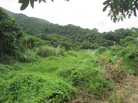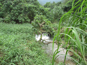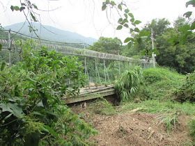 「左昭右穆」附近的雜草林已被清除過,去年那裡的水泥路還是一道不明顯的路胚,那時更是全年雜草藤蔓最少的二月,現時植物生長旺季剛過,卻變成了康莊大道,如果他們也肯到其他地區幫忙,把幾近湮沒的古道(如谷埔至尖光峒坳)重新打通就好了。探過「左昭右穆」大墳,就穿新桂田左坑之上往荒廢的新桂田村,為避開左坑的沼澤及水漥,大隊「建議」的穿越方法是踩著水管,抓著圍網而行。