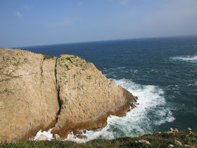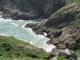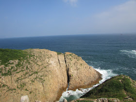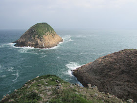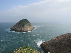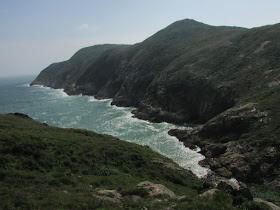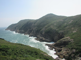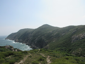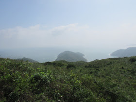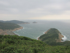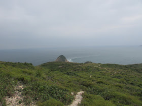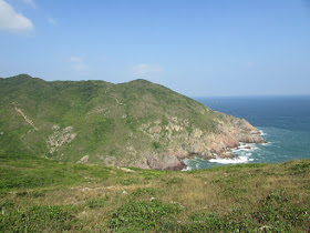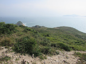穿過長岩坑上長岩頂,再向南走至罾棚角咀,全程需時大半小時,沿途雖然有不少草坡,但中間無緣無故有幾堆小密林,有的甚至帶有亂藤,感覺倒是格格不入,據說是早年漁護署刻意植林的結果(還是後果?),除了綠化本身較光禿的山頭外,還防止經驗不足者亂走小路,讓他們知難而退。隨著高度陸續的下降,終於抵達罾棚角咀,眼前的只是飯甑洲、旁邊兩座被沖刷至寸草不生的崖壁及一望無際的南海,白頭浪乘著清勁季候風而至,身處其中真有遠在天涯之感。