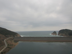幾台旅遊巴停在東壩前: