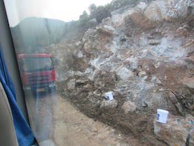 旅遊巴要先停在一旁,讓卡車處理路旁塌方作業後才可繼續起程: