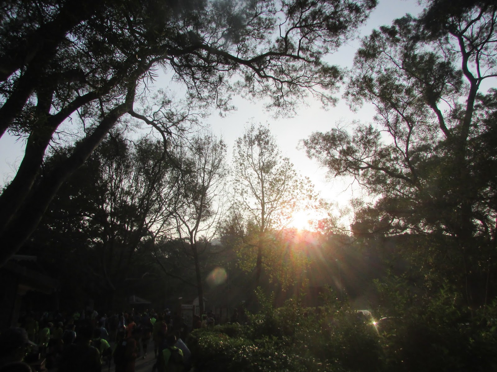 說回正題,七點左右到太子站乘專車到北潭涌,到傷舞樂園報到處時很多參加者已準備,扣好號碼布及寄存行李後,八點四十分左右在較有利的位置等候起步,未到九點就突然宣佈開始,有的參賽者意料不及,大家當然一窩蜂的慢跑。到萬宜坳時可能只有兩個義工的關係,情況非常混亂,大量人搶先恐後蓋印,把鐵架子也撞至猛力搖晃,差點整個塌下,那個位置根本不適合作檢查點,因為只是剛開始,加上正處大路,人流非常密集,縱使再多幾個義工也未必足夠應付。依北潭郊遊徑而上,過了北潭坳後參加者密度開始下降,至赤徑檢查點時已變暢順,翻過大浪坳落鹹田灣,可惜此時小腿已有輕微抽筋,在平路不能快跑了。