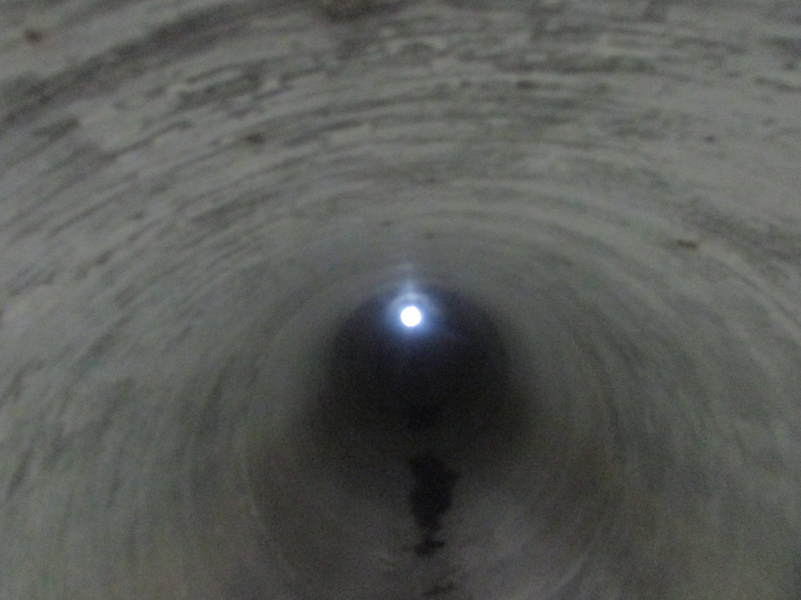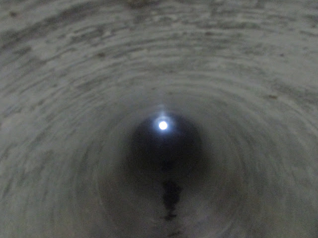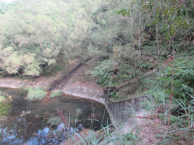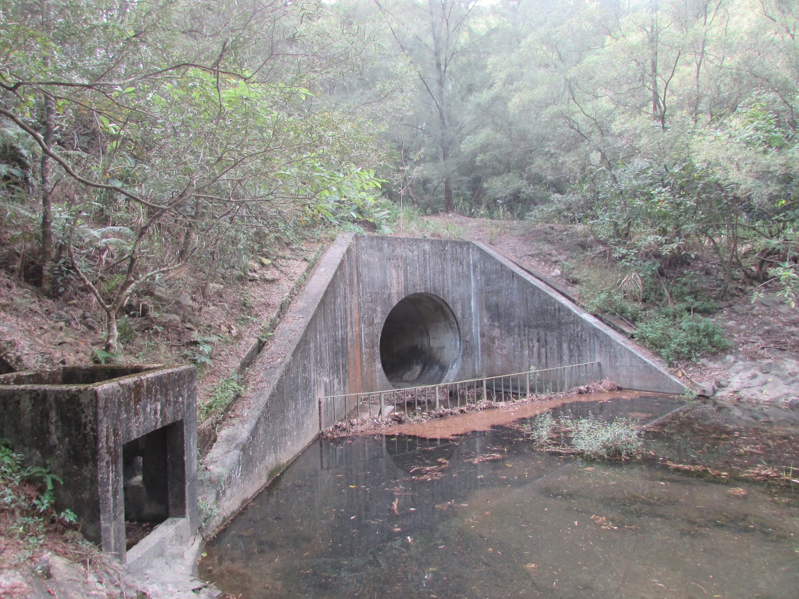 穿過通道需時約一分半鐘,只要望著出口燈光而行,其實不用亮電筒的,當然為安全起見,坳仔也建議探遊人士帶備電筒為佳。離動物通道不遠處見一蓄水池,很小心的下達池邊,但池裡死水一片,自然吸引不少藻類生長,然後就經一段極陡斜的斜坡穿墳區上引水道。