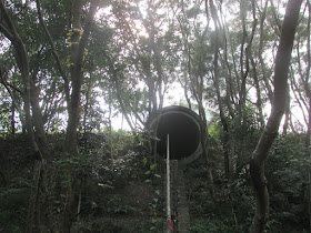 穿過通道需時約一分半鐘,只要望著出口燈光而行,其實不用亮電筒的,當然為安全起見,坳仔也建議探遊人士帶備電筒為佳。離動物通道不遠處見一蓄水池,很小心的下達池邊,但池裡死水一片,自然吸引不少藻類生長,然後就經一段極陡斜的斜坡穿墳區上引水道。