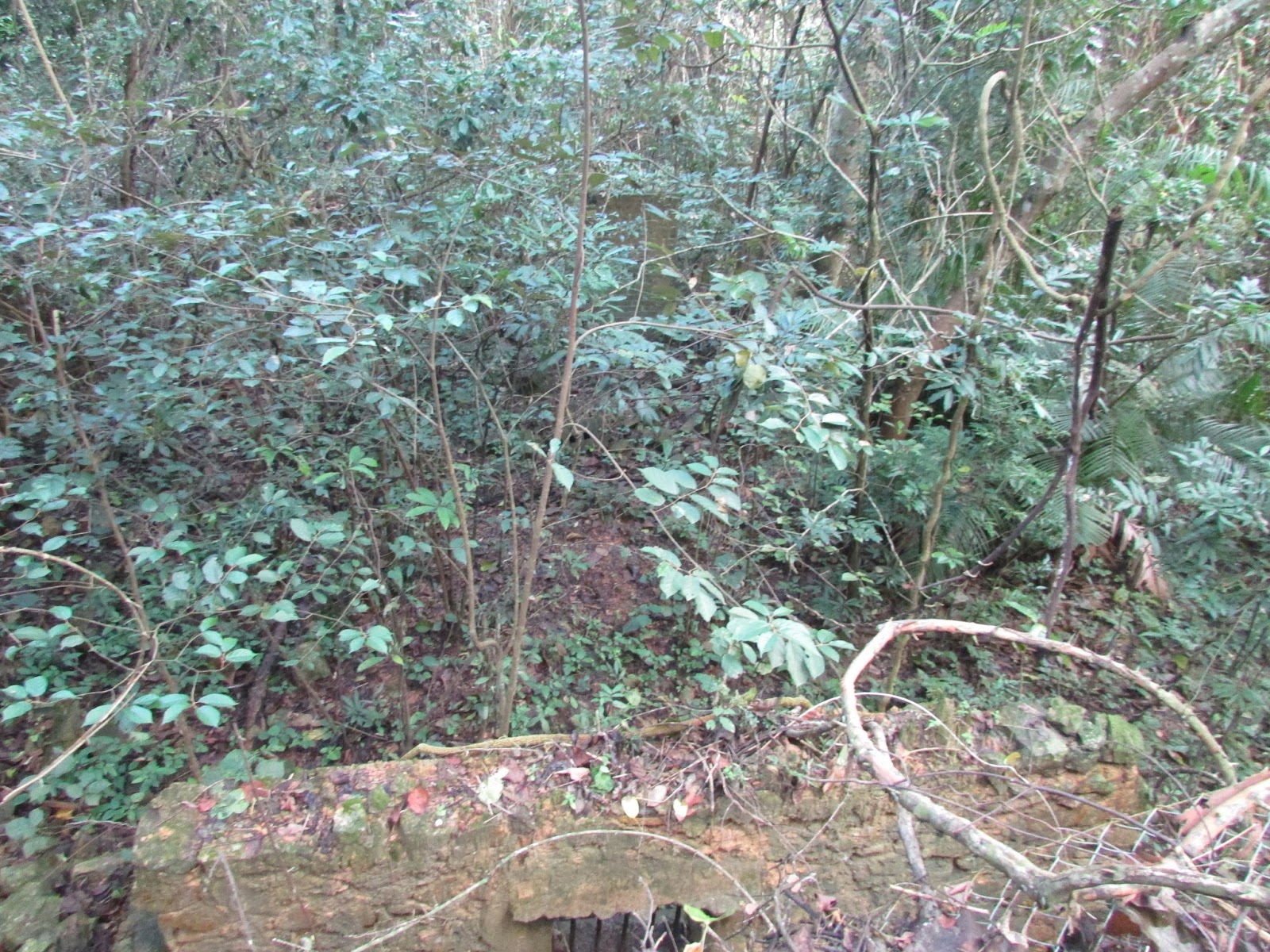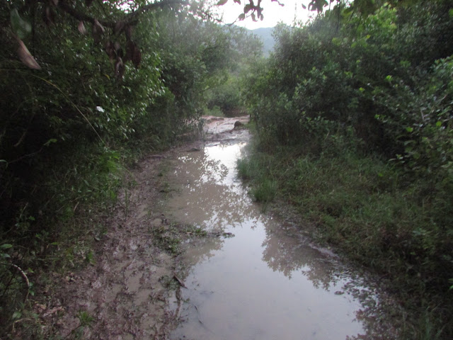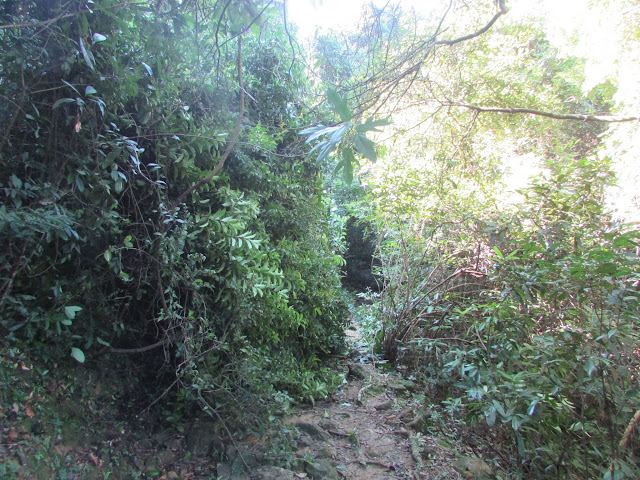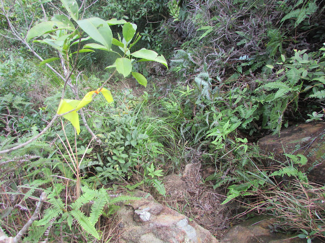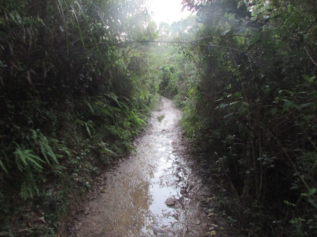 或許是前一天雨量實在太大,三椏涌一帶的山徑變得相當泥濘,之後經過下苗田的澗道時更被水淹,走了多次「下路」,第一次需要涉水而行(幾個月前亦曾在大雨後一兩天走「下路」,但路況並不如是日為差,當時日雨量還達一百毫米以上),後來臨到九擔租時全段大路都被水淹,只能踏著旁邊雜草,如果只想到三椏閒遊的人來說,相信一起步沒多久就要掉頭,因為路面實在太恐怖了,平時只需五十五分鐘左右就由三椏至烏蛟騰,是日就要多花十五分鐘,兩星期前小巴站到晚上還是人山人海,是日相同時段卻僅三人,可謂天壤之別。