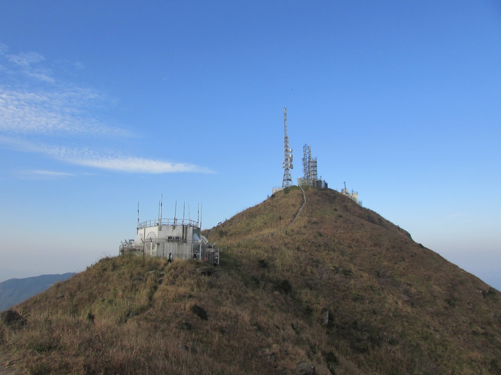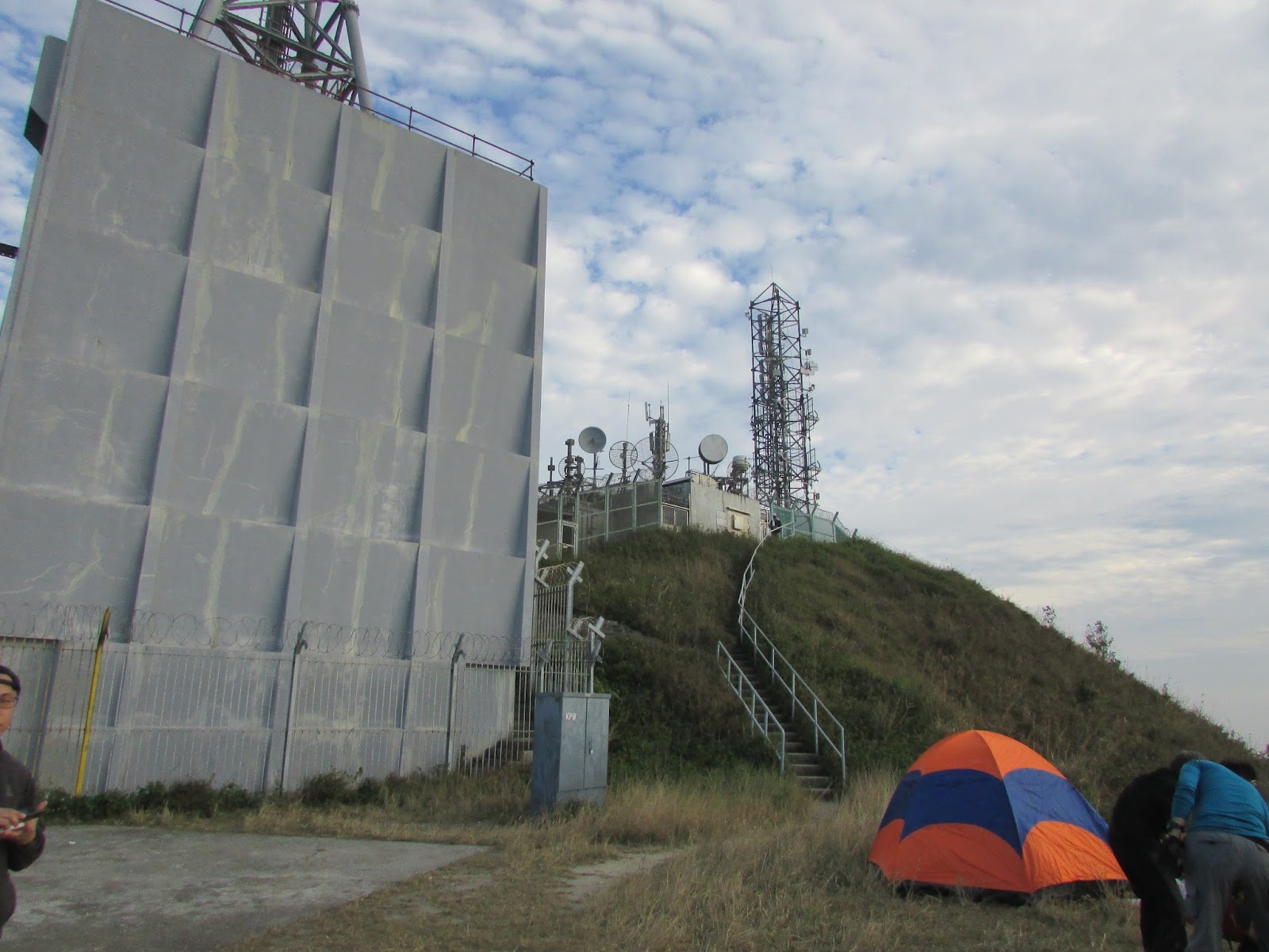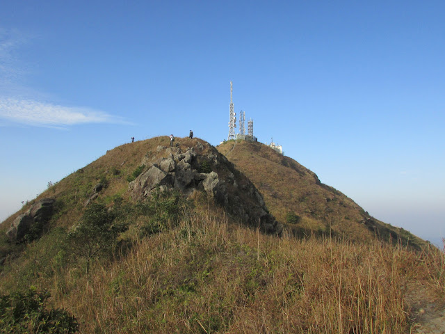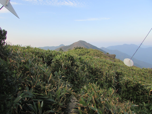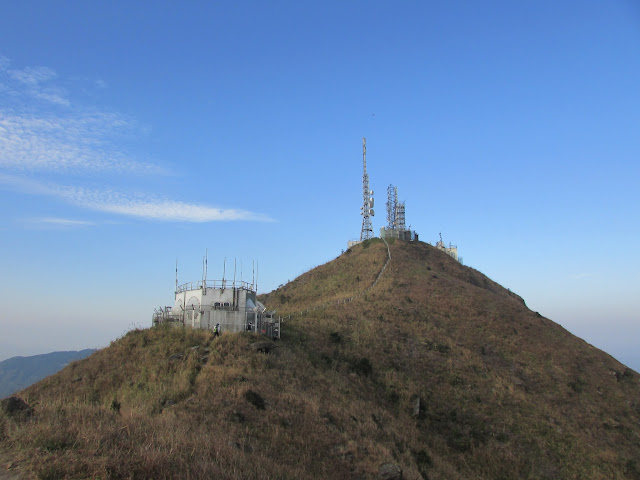 在崖頂休息約十分鐘,再接一段山脊路抵飛鵝山頂,山頂有座無線電站,旁邊還有一座標高柱及直升機坪。直升機坪上放了個營幕,起初沒有為意,幾天後再看網上照片,才知當晚很多遊人在機坪上露營,方便迎接新一年的日出,相信有不少都是突然愛上遠足的新手,他們只為在社交網絡「呃Like」的Yama Boys及Yama Girls之流,不過在機坪上露營是會影響救援工作,當直升機靠近時也會對機坪上的人產生危險,或許他們覺得遠足與行街購物沒太大分別,最多是用的體力辛苦點而已,但公德心及安全意識更應提高,最起碼不要隨處棄置垃圾(別期望山上的清潔工人也與山下的多),亦不要在臨入黑才上山。