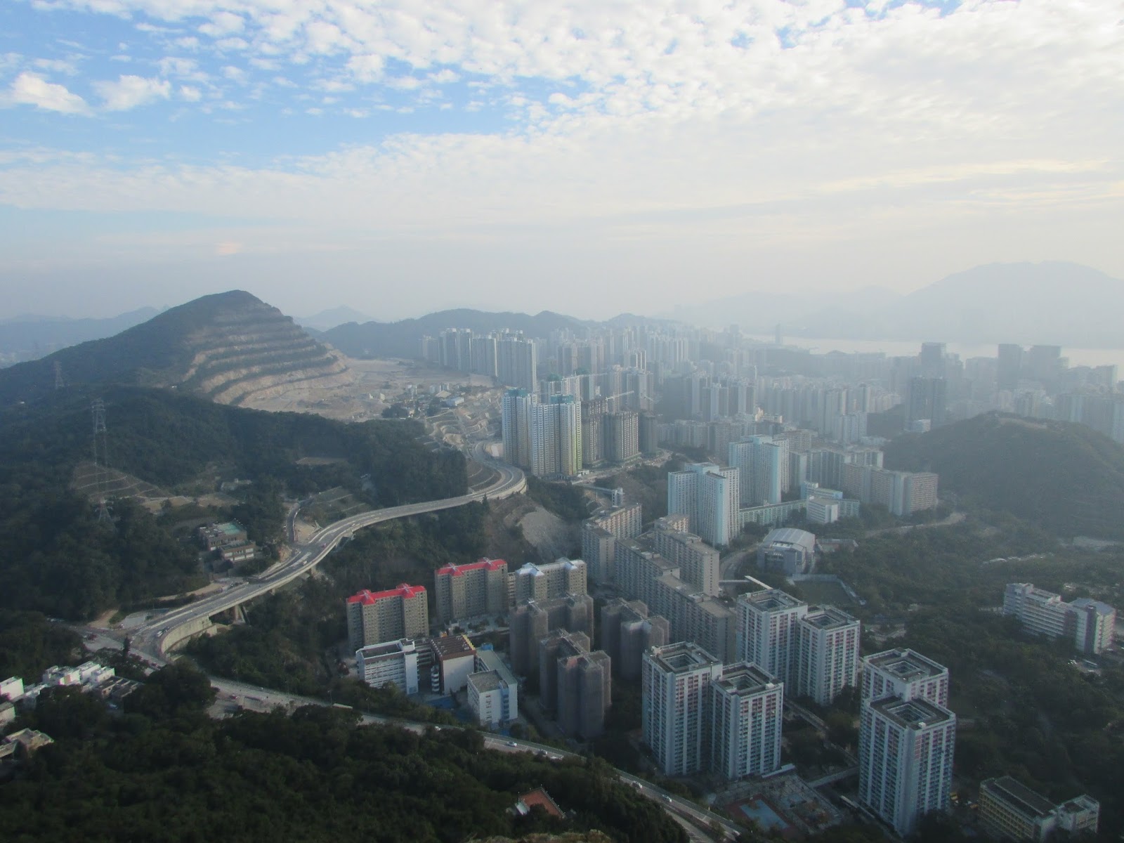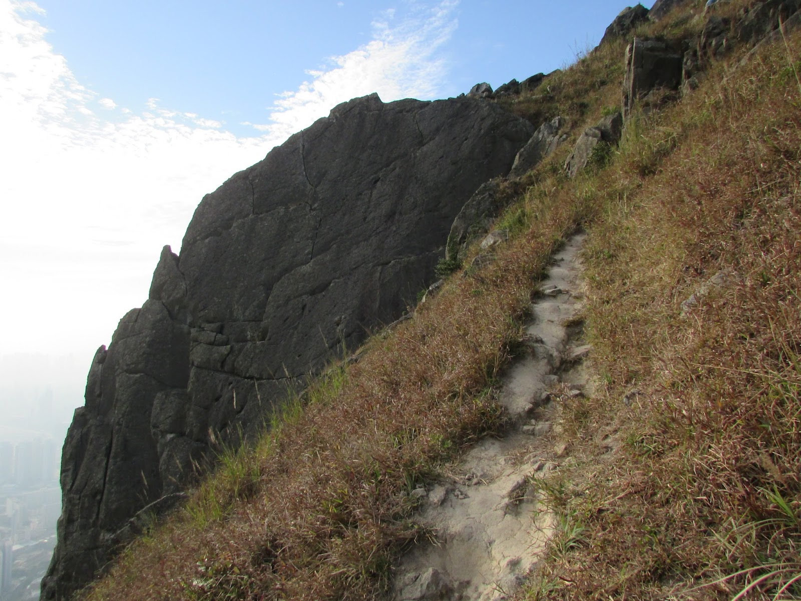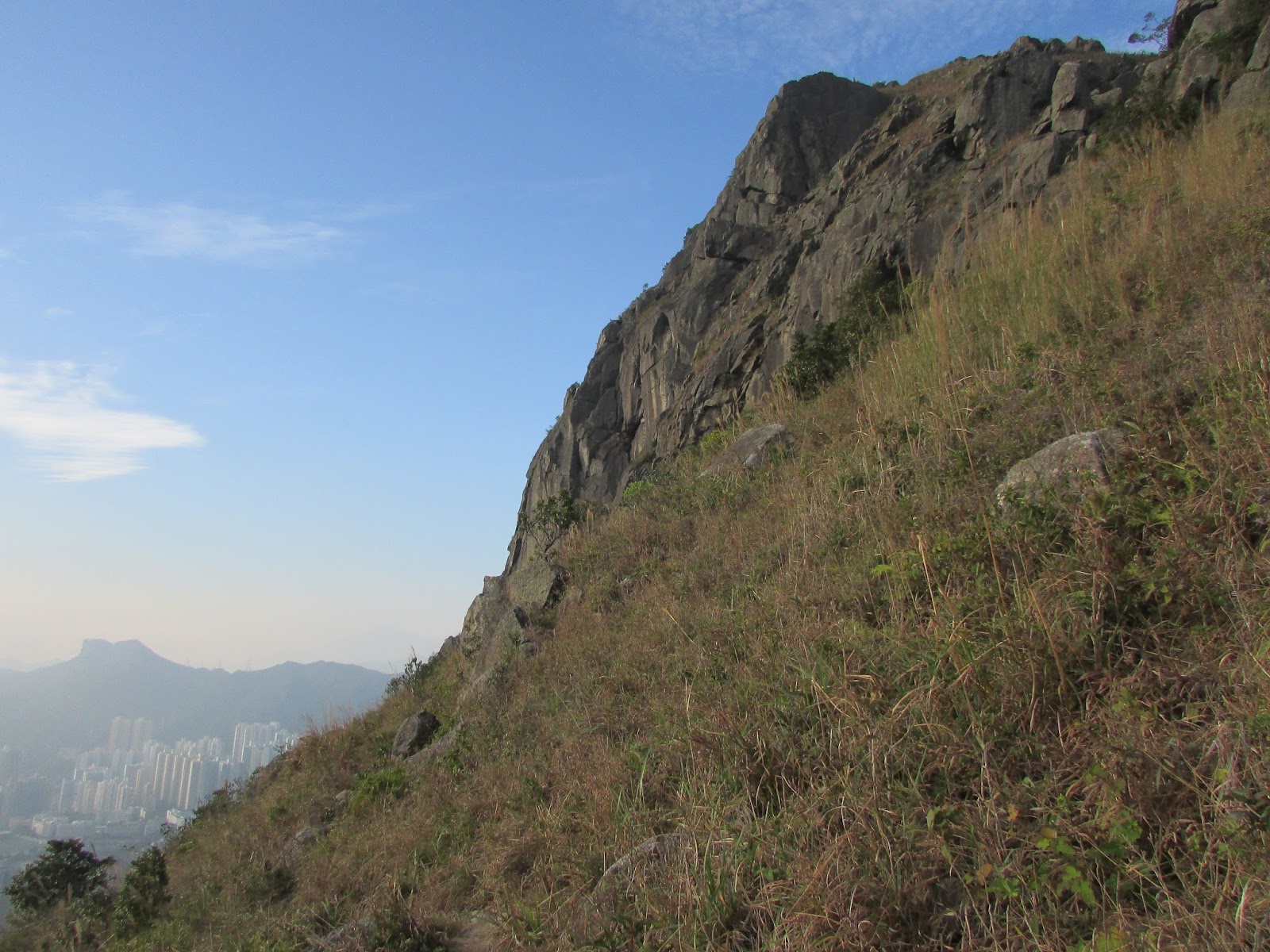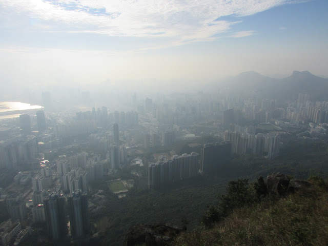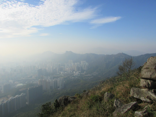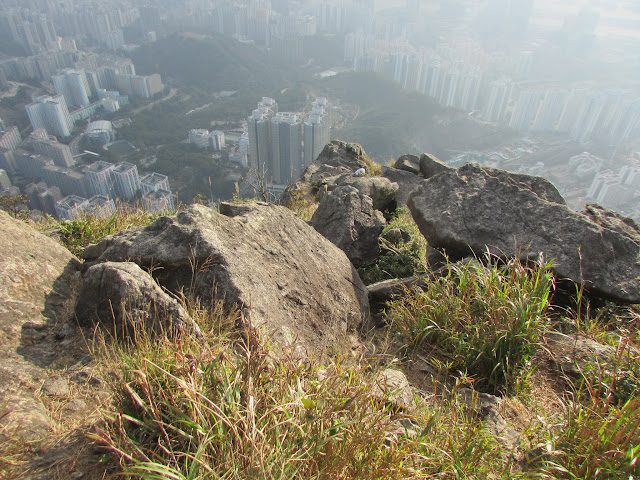三點十五分在順利邨起步,經順緻苑沿樓梯上清水灣道,再轉上飛鵝山道茶寮坳路口。一開始是稍斜的路,十餘分鐘步程到高分叉路口,左為高危線,右為崎嶇線(崎嶇線難度較高危線更高),最後在海拔約五百米的「自殺崖」附近會合。高危線在崖邊盤旋而上,所以在部分位置滑腳就會容易遇事了,但整體沒有險要位置要過的,縱使有都可在旁邊繞過。上走大半小時,看到面積很大的崖壁,表示快到「自殺崖」。「自殺崖」位處飛鵝山南脊,景觀幾無阻隔,遊人可飽覽黃大仙區、觀塘區、港島北、維港及獅子山的風光,可惜是日有霧霾,污染物被午後陽光射得正著,使美景大打折扣。崖下雖是近百米之深淵,不過崖頂岩層是稍為向內凹入,只要不是站得太出,單純賞景的話還算安全的。