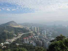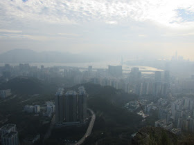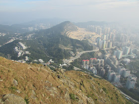 三點十五分在順利邨起步,經順緻苑沿樓梯上清水灣道,再轉上飛鵝山道茶寮坳路口。一開始是稍斜的路,十餘分鐘步程到高分叉路口,左為高危線,右為崎嶇線(崎嶇線難度較高危線更高),最後在海拔約五百米的「自殺崖」附近會合。高危線在崖邊盤旋而上,所以在部分位置滑腳就會容易遇事了,但整體沒有險要位置要過的,縱使有都可在旁邊繞過。上走大半小時,看到面積很大的崖壁,表示快到「自殺崖」。「自殺崖」位處飛鵝山南脊,景觀幾無阻隔,遊人可飽覽黃大仙區、觀塘區、港島北、維港及獅子山的風光,可惜是日有霧霾,污染物被午後陽光射得正著,使美景大打折扣。崖下雖是近百米之深淵,不過崖頂岩層是稍為向內凹入,只要不是站得太出,單純賞景的話還算安全的。