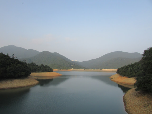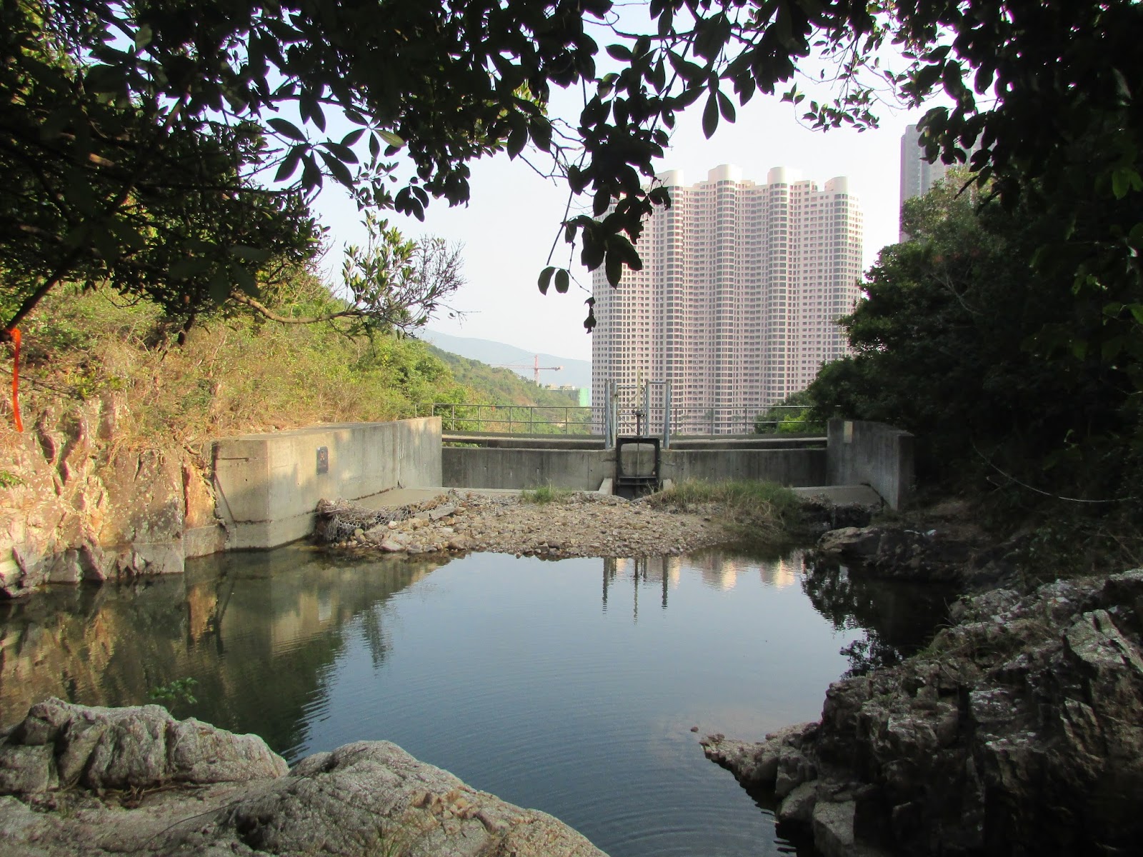 大潭水塘始建在前世紀末至上世紀初期,原意為港島區提供食水,共分四座水塘,由北至南,依次為「上、副、中、篤」,前兩塘為一組,後兩塘為另一組,中間則是「雙潭石澗」,歷史則由南至北依次遞增。水塘已有過百年歷史,當中的廿一座水務設施包括石橋、水壩、掣房等都被列作法定古蹟,並以「水務文物徑」連接,屬熱門的郊遊地點。沿車路經水塘群緩緩上行,在石橋、水壩群古蹟間穿插,正值夕陽西下時分,雖然太陽未能直至在水塘上,不過在柔和光線映射下,倒是突出水塘的靜美的一面。