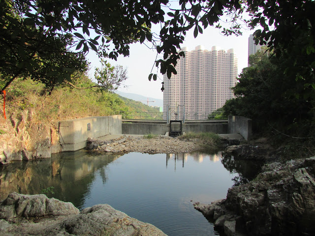 在澗道花了約十分鐘覓路,轉林中小徑上龜山,龜山頂景觀較馬坑山更差,只可見大潭港的一角,之後又沿密林轉上蓮花井山,亦是無景賞的山頭,只有一座以紅磚砌成的標高柱基座,為沉悶的闖林旅途帶來「新意」。然而此時已差不多四點半,如繼續往長連山再落大潭水塘的話唯恐不夠時間,想起大潭水塘已有好一段時間沒到,而且在本Blog中也無相關遊記,故在此直落大潭篤水塘馬路閘門附近。
