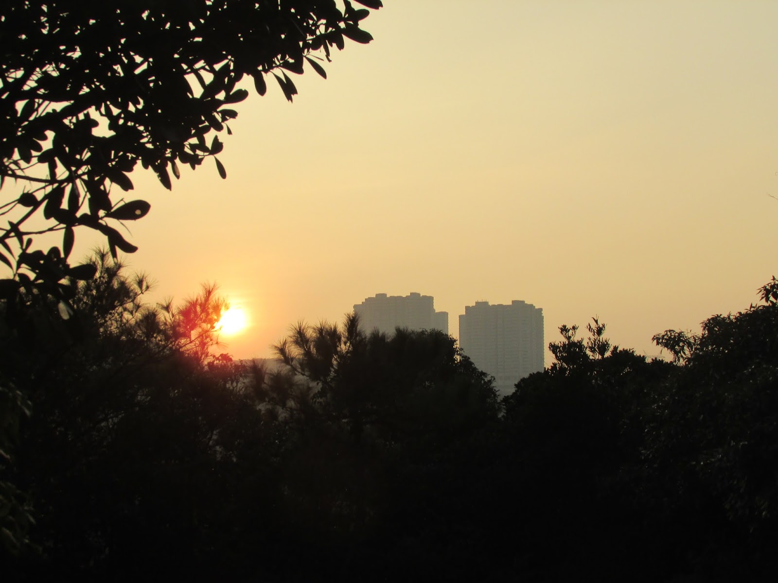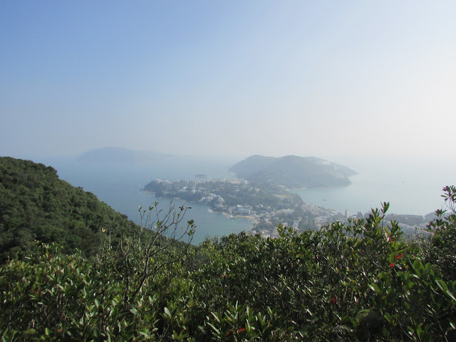 在赤柱峽道下車上孖崗山,正常來說在「衛奕信徑」站下車,不過坳仔就早下了一個站,結果一上山就要爬上澗道斜壁,爬上引水道後朝東走小段接衛奕信徑。由巴士站上孖崗山名乎其實的「天梯」,需爬1369級樓梯才到南峰山頂,落淺水灣坳一段是另一道「天梯」,梯級總數亦有1209級,不過最高點只有386米,所以梯級數目沒有大東山、鳳凰山的大路為多。上山時邊賞景邊休息,以回望整個赤柱半島的風光為主,此段以逆走為佳。未到孖崗山時把握機會留影,之後的路段基本上無景可賞了。