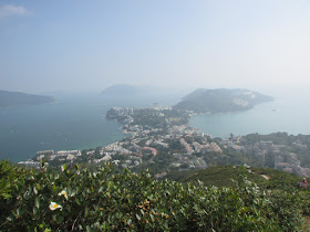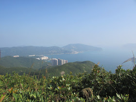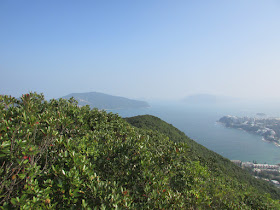 在赤柱峽道下車上孖崗山,正常來說在「衛奕信徑」站下車,不過坳仔就早下了一個站,結果一上山就要爬上澗道斜壁,爬上引水道後朝東走小段接衛奕信徑。由巴士站上孖崗山名乎其實的「天梯」,需爬1369級樓梯才到南峰山頂,落淺水灣坳一段是另一道「天梯」,梯級總數亦有1209級,不過最高點只有386米,所以梯級數目沒有大東山、鳳凰山的大路為多。上山時邊賞景邊休息,以回望整個赤柱半島的風光為主,此段以逆走為佳。未到孖崗山時把握機會留影,之後的路段基本上無景可賞了。