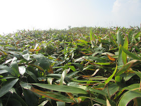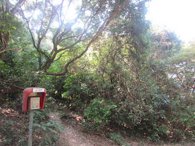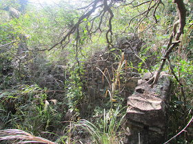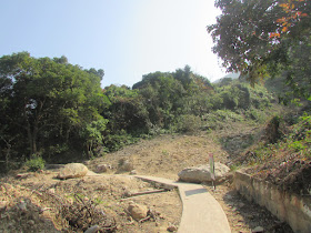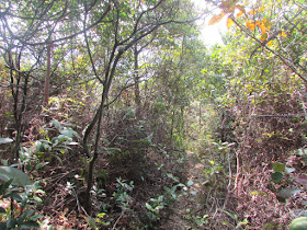 半小時步程見空曠地方,看地圖位置將近鹿湖,正當以為傳說中的結界「無料到」之際,身後發現有一道不明小徑,而且前面是個大V谷,低點約海拔160米,接著還得急攀上海拔236米的山崗,然後再急落至鹿赤走廊近鹿湖,途中亦見一些不明叉路,幸好太陽位處偏西南面,而坳仔也向西南方走,所以一分鐘的迷路也沒有。上次傳說中的結界正處夏天高溫高濕度的環境,事主一離開大路就要急上再急落,已耗用不少體力,之後還要身處在焗促的灌木林中,望著稀疏引路帶(一定不會較現時多)及眾多不明交叉點覓路,而且從地圖看,臨到真正上大蚊山前,亦有隱蔽橫山路東走至南脊。如果體力不足,加上心理因素及實際環境下,相信在236山頭至上大蚊山的坳位支路間不斷打圈其實不難,看來傳說中的結界並非子虛烏有。