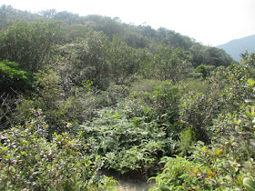 由大浪坳起計至大蚊山頂約半小時多點,然而山頂已完全被叢林遮蓋,所以無景可賞,自然無法吸引遊人。在山頂稍休十分鐘,轉往對面右路經西南脊落鹿湖(左路經南脊落西灣,上次走過,叢林極密),此路也是半年前某獨行者遇事的地方。往鹿湖的路近月可能較多人走訪,所以引路帶不少,叢林明顯沒有想像中為密,除中段有一兩道旱澗處路況略為模糊外,整體環境不易使人迷途。