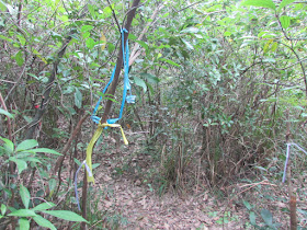 在紅石門逗留半小時,轉上山崗往烏洲塘,沿途仍是密林地帶為主,望向海邊忽然看到近處的烏洲島,過往幾次經過烏洲塘時都不見,究竟坳仔一直沒留意,還是有前輩刻意的修剪遮著烏洲景觀的密林?朝小徑緩步下行,穿過已荒廢的烏洲塘村,只餘下大屋的下半壁輪廊,再前走一分鐘抵達花籃坑澗道,較下游處有傳說中的壺穴,不過是日獨行,探壺穴的環節就免了,於是過澗朝南面上鳳凰笏頂附近,途中一直都在花籃坑澗道旁走。上山初段是烏洲塘村的廢田區遺跡,現在都長滿雜樹,部分位置路況撲朔迷離,有的引路帶在錯誤位置綁上,結果在疑似小路再上一兩分鐘,發現再無路標,才知走錯路,正路原來藏在樹木間。上山路都以樹林地帶為主,間中是密林,之後就要轉右過花籃坑上游後再急上,295山頭就在前面,不過名字不好意頭,新正頭就不上了,取南面橫山小徑直出小滘坳,此段路較幾年前明顯好走不少。