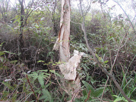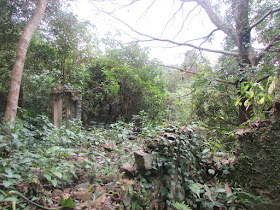 橫山腳上、下村之間的山坳叫「關爺坳」,據說以前曾建有關爺廟,現在當然也是一片頹垣敗瓦。在關爺坳接隱蔽小徑而下,十分鐘步程至關爺坑,旁邊可見完整的田基殘垣,之後又是在荒僻小徑間亂走,途中亦經一些鳳尾竹叢,環境與「迷椏走廊」馬尿河至黃竹涌一帶相似,當然規模沒較那裡大。走著走著,又接回橫七古道了,朝北穿過橫山腳北橋及廢田區,在W132附近轉往烏蛟騰方向,沿途都不要期望有甚美景可看了,最多在某片開揚位置盡脊鹿頸的全貌而已。轉入「老虎跳牆脊」落烏蛟騰抗日紀念碑附近,又是從未聽過的名字,據指取自臨到烏蛟騰時的「老虎跳牆」的風水墳,此脊人工密林滿佈,全段都是崗松或鐵芒萁,所以基本上無景可賞,亦看似近來才重新打通(此隊多把幾近湮沒的小徑重新打通)。