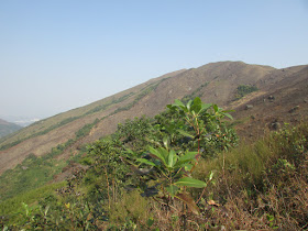 一點在蕉徑巴士站下車,地圖顯示附近最少兩個上山入口,分別在蕉徑彭屋及粉錦公路蕉徑至打石湖橋頭之間,不過在村口觀察山形地勢,發現後者的山路似乎好走一些,所以循公路逆行一段,過橋接樓梯上雞公嶺。隨著高度上升,整個粉嶺、上水區的景色變得一覽無遺,最近處是蕉徑、長瀝至坑頭大布的廣闊平原及農地,「擔水坑」貫穿平原而過,再經雙魚河、梧桐河、深圳河流入后海灣;在平原另一端,粉錦公路的對面,則是古洞南「歌賦嶺」及「邁爾豪園」等別墅區,亦有備受爭議的「香港高爾夫球會」,很多人希望在此重建成新住宅區;最遠處則是粉嶺及上水的新市鎮區,而大石磨、深圳福田區則在視野的左面,陽光正射在深圳地標高樓「京基100」的玻璃幕牆上,幕牆反射的光芒非常耀目,十多里外都可見。