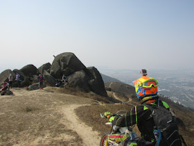 到達雞公嶺最高點,不斷有人在標高柱停下休息,要不斷的遷就位置才可避免攝人入近鏡。近月雞公嶺被山火燒過,短草、小樹都被燒光,地上泥土都變成碎球狀了。由於雞公嶺也是越野電單車的勝地,那裡被山火洗劫過後地上泥土都呈現一道道被電單車壓實的痕跡,植物變得難以生長。山頂西面有一堆大石,又名「英雄石」,現是不少越野電單車手的「聚腳地」,在此以欣賞八鄉、石崗的風光為主,之後就要在荒土中尋回「英雄石北脊」的路胚落牛潭尾了。