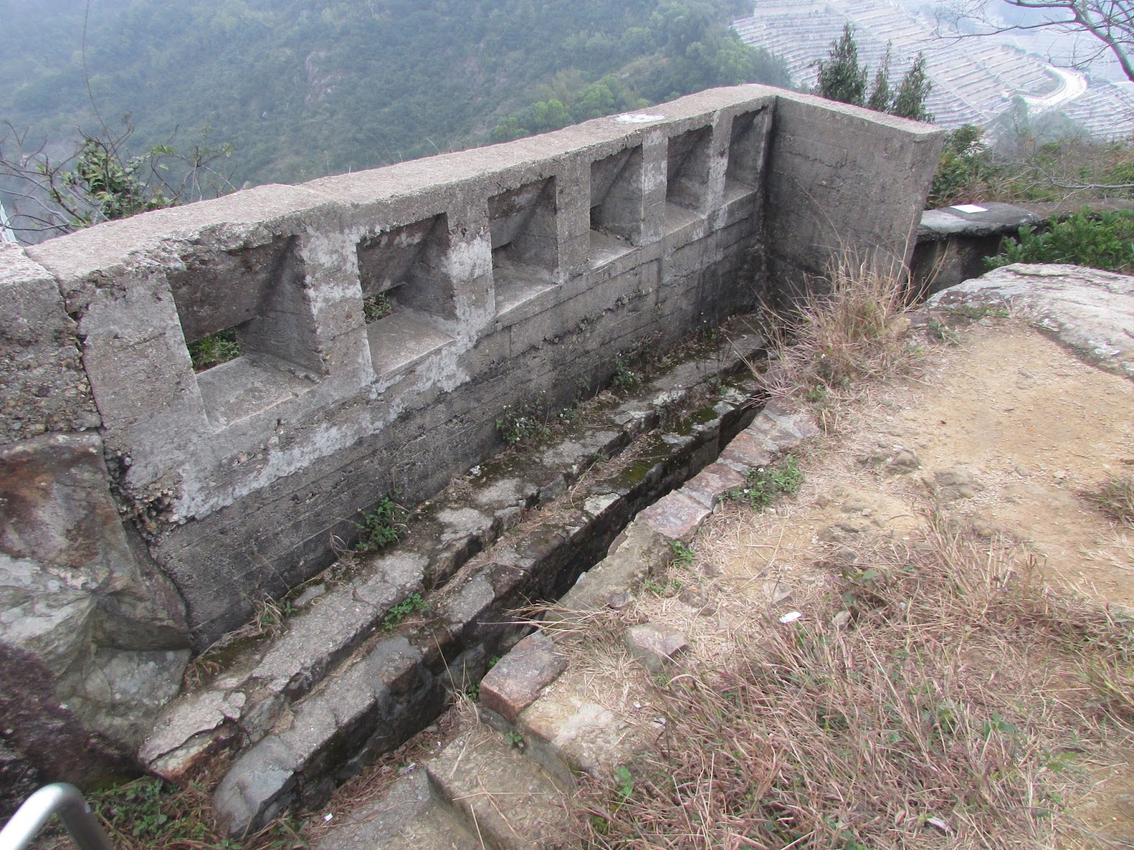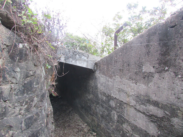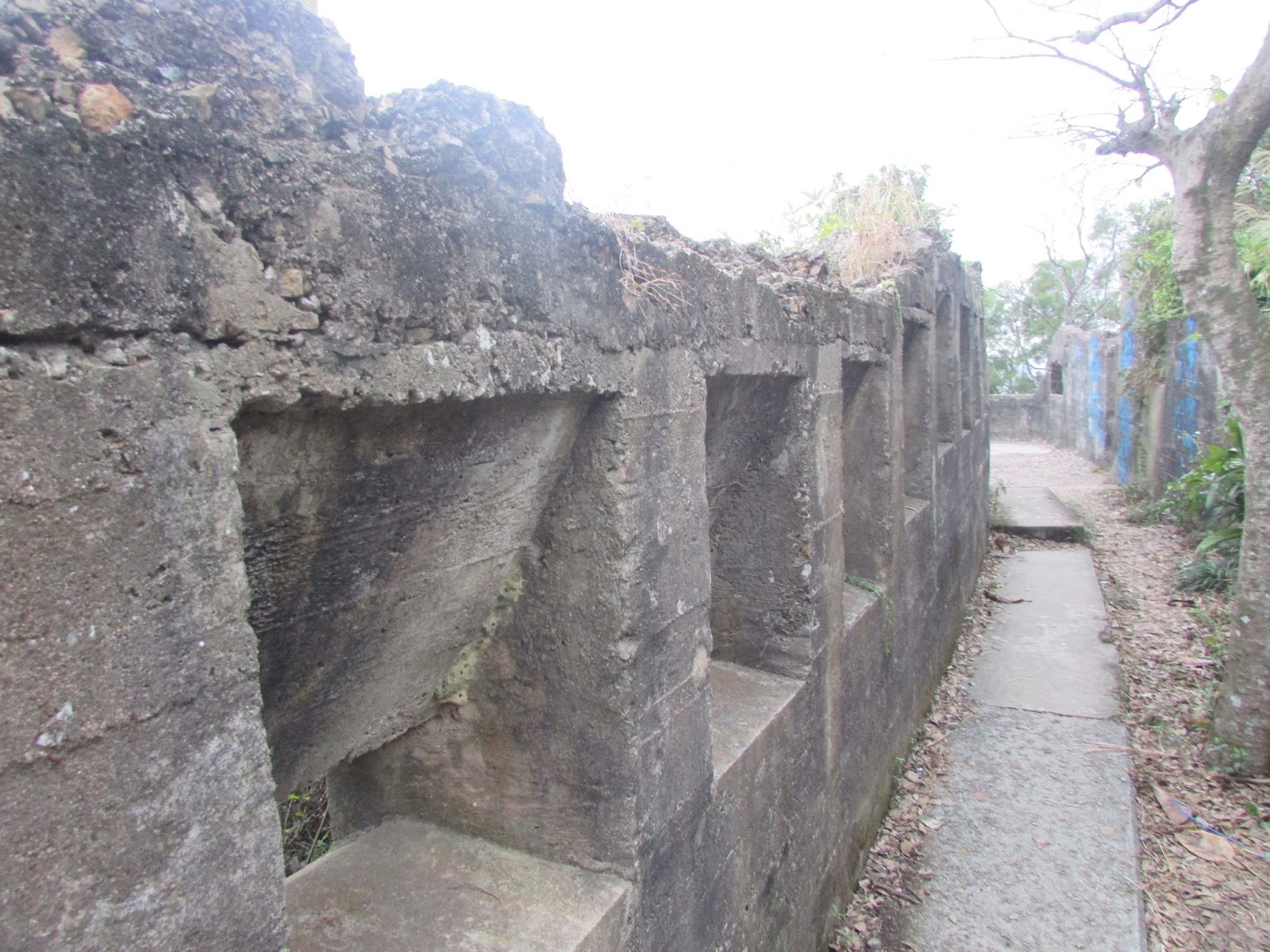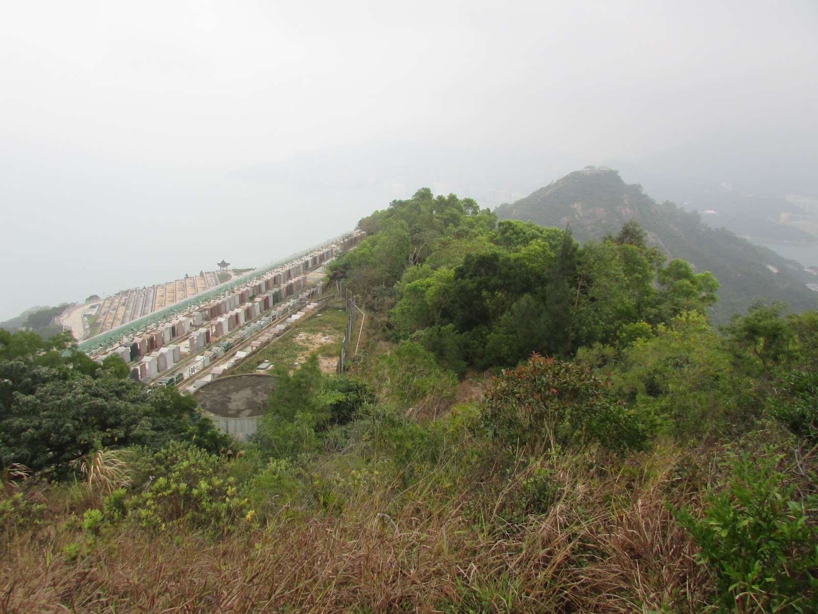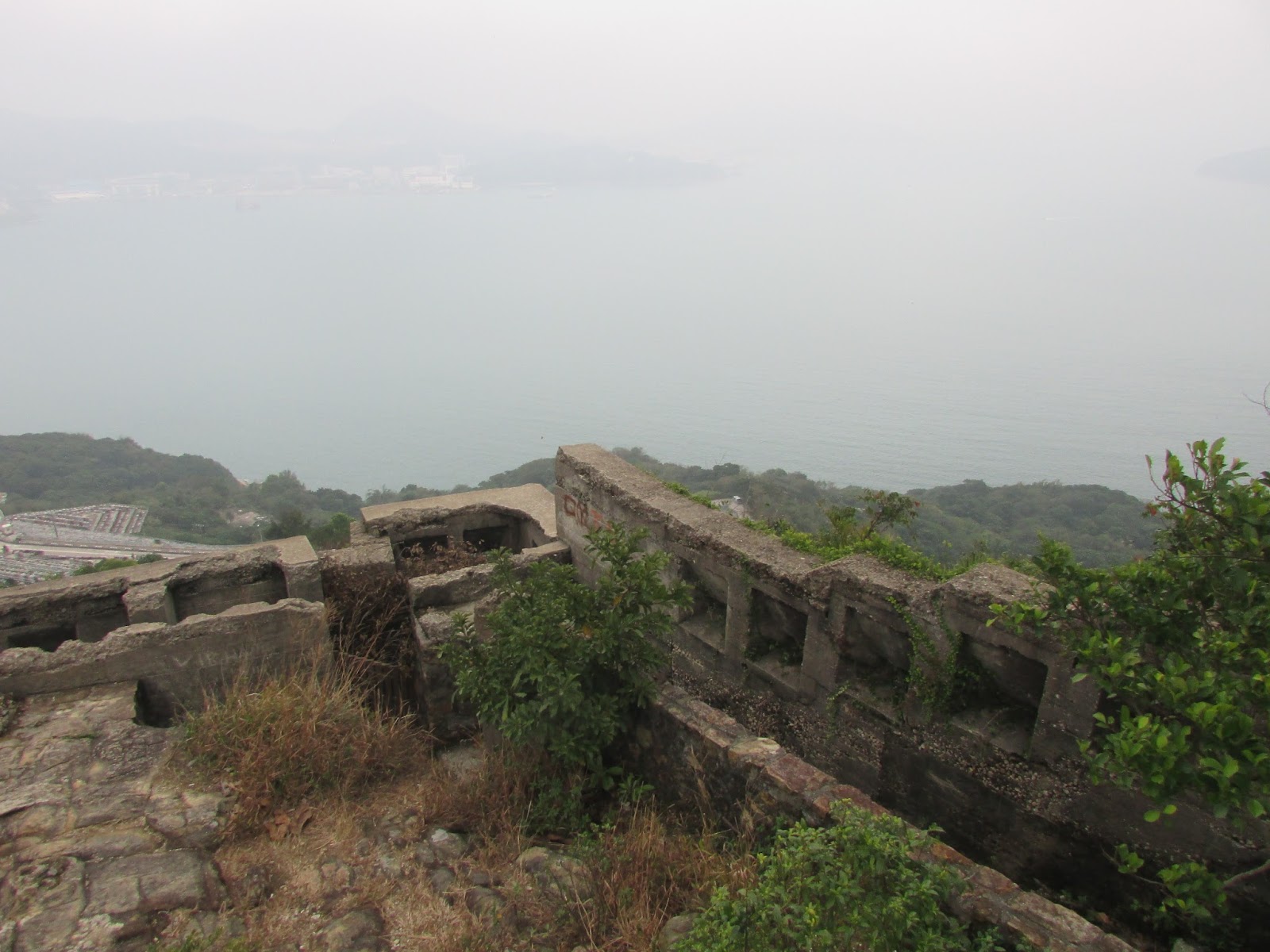 在墳場附近轉上魔鬼山頂(222米,亦稱炮台山),那裡位處維港東面的鯉魚門入口之上,所以自英國租借新界後就成為軍事基地,用作抵抗外敵(包括日軍)入侵,然而二戰時日軍從西面的醉酒灣防線而襲,魔鬼山炮台自然沒有用武之地,之後一直荒廢至今,仍可見明顯的炮台、堡壘、火藥庫痕跡,但受風吹雨打、遊人破壞等因素外,痕跡已逐漸變得不太完整了,那裡也可盡賞港島東、鯉魚門及觀塘區的風光,可惜是日能見度實在太低,近處也是一片模糊。