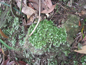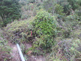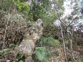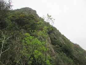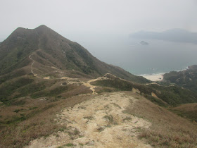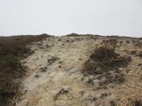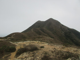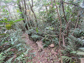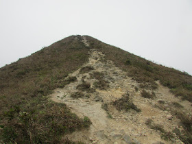 原來雲底高度剛好到達蚺蛇尖,所以大浪四灣的景色間中被薄霧籠罩,雲層則從東面而至,一過山頂就明顯消散,形成一幅有趣的畫面。在山頂休息廿分鐘,然後朝東面落米粉頂山脊,初段斜度頗高,更有一堵小直壁,看清踏腳位慢慢下降。從米粉頂下降東灣山坳的一段極多浮沙碎石,斜度也很高,同樣要細步下行才可避免滑倒,感覺較從大浪坳至蚺蛇尖的一段更為難行,幸好過往的樂善盃比賽都不經那段碎石滿佈的山脊,否則會對參賽者帶來很大危險了。東灣山坳海拔約二百米,還要再上約百米才到東灣山頂,可是雙腿已有疲倦感,所以繞經北面的環腰密林小徑,然後再落長咀坳。