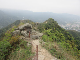 走著走著,慢走大半小時,到達全程最高點大刀屻,景色仍以林村谷、大帽山及雞公嶺為主,但靠北處受林木所阻,所以八鄉及粉錦公路的景觀都較難看清楚,直至走至較西面位置為止。山頂以西乃全脊最窄處「刀屻天險」(亦稱「金銀橋」)所在,坳仔自走過蚺蛇北脊、狗牙嶺後那裡已不覺是甚麼回事,但對經驗不多的人來說可說險要了,所以漁護署亦顧及他們安全,在此放了一些欄杆,降低遊人的心理壓力。離開「金銀橋」後朝「白牛石」下山,雖然中段還要再上一座小山崗,而且斜度亦頗高,不過很快就能捱過,約大半小時下達嘉道理農場,再經林錦公路旁徒步落上村,乘巴士回荃灣作結,可是此段行人路非常窄,甚至被大樹斷開,而且急彎又多,所以坳仔不太建議大家這樣走了。