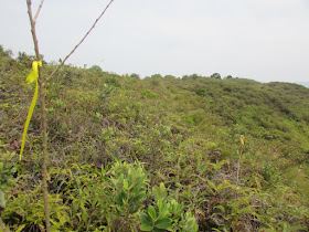 橫排山位處三椏村以東、牛屎湖山另一邊,本來是欣賞三椏灣及牛屎湖內灣的最佳地方,坳仔早前曾兩度到此探路(其中一次在前年十一月),可惜遊人實在太少的緣故,灌木叢已密至不能通行。然而,從網上得知近來有人成功走訪橫排山,換言之此路已重新打通,所以坳仔是日就決定一探,再從山上覓路落牛屎湖村。