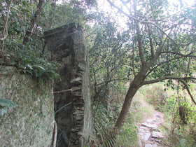 繼續從三椏經苗三古道回烏蛟騰,古道變成工地,還以為純粹解決山徑雨後的泥濘問題,原來區議會要把古道至荔枝窩的路建成「主題性行山徑」,作為社區重點項目的一部分,把現有的路擴闊之餘,連過澗的小橋、樁柱及石板都會被翻新,詳情可參閱區議會文件()。古道中的上、下苗田村都已荒廢,下苗田的廢屋在風吹雨打下逐漸破落,只餘頹垣半壁,地上還有一些新近塌下的磚瓦,而上苗田的廢屋更已湮沒在林中,要深入塌樹陣中才找到餘下的一座廢屋,從大路上的路碑可見,多年前或許還能指出廢屋廢田的位置,只是近來已被塌樹重重包圍,如無路碑,相信大家都不知以前曾有一村。六點半到烏蛟騰,然後乘坐七點十五分的小巴回市區作結。