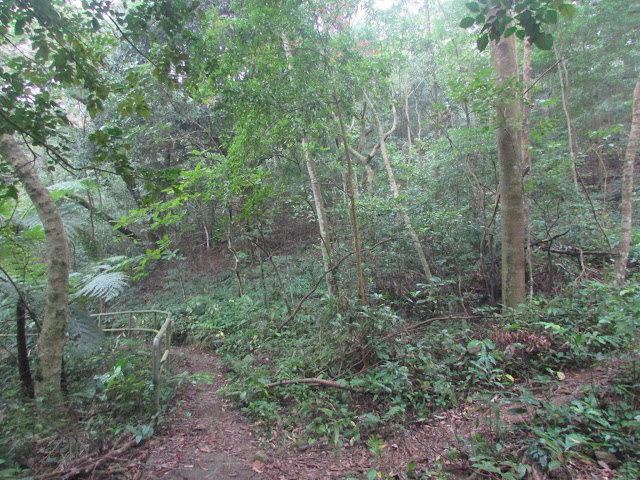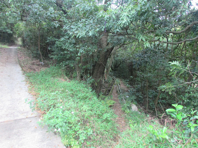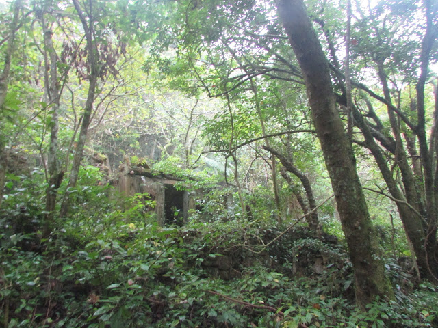 轉入樹林中的長瀝尾路口,望向前方的樹林猶如仙境般,雖然只是微雨,樹葉卻一早聚滿水份,小雨點打在樹葉時發出明顯的淅瀝淅瀝聲。在樹林小徑盤旋下行,十餘分鐘步程看見一道鐵欄杆,原來已到長瀝尾廢村,可見約四五座僅一層高的廢屋建在石壆上,屋前都長滿野草,亦因野草積水頗多,所以無謂深入探索了,跟隨隊標,沿水泥路直出往馬料村中間的坑口。往來長瀝尾村的水泥路相當完整,廢村有水泥徑連接並不出奇,因當年的「嘉道理農業輔助會(KAAA)」曾資助不少偏遠鄉村修路,但想不到的還是鐵欄杆,相信長瀝尾村並不算荒廢了太長時間。