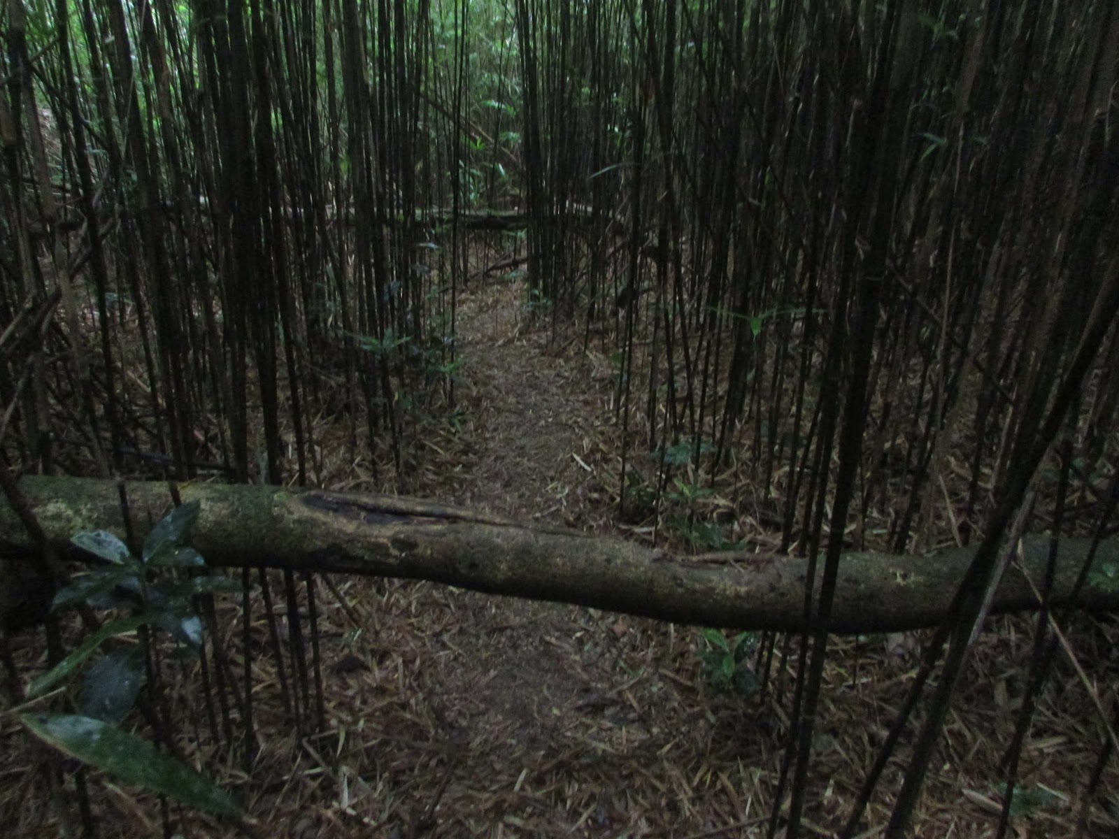 在坑口轉入小徑,跨越狗肚坑澗道,然後在林中而行,轉上竹林隧道往大埔滘黃路,那段路如無引路帶的話會很易迷途,所以不要盲目的追求道德光環,連那裡的引路帶都給拆去了。竹林隧道本身已是林蔽蔭日的路段,加上是日更是天陰,環境像在臨入黑的時間,有點刺激,最後花了約十分鐘穿過隧道,長度較燕岩的竹林不相伯仲,只是燕岩的竹樹較粗,再過幾分鐘就到達大埔滘黃路了。