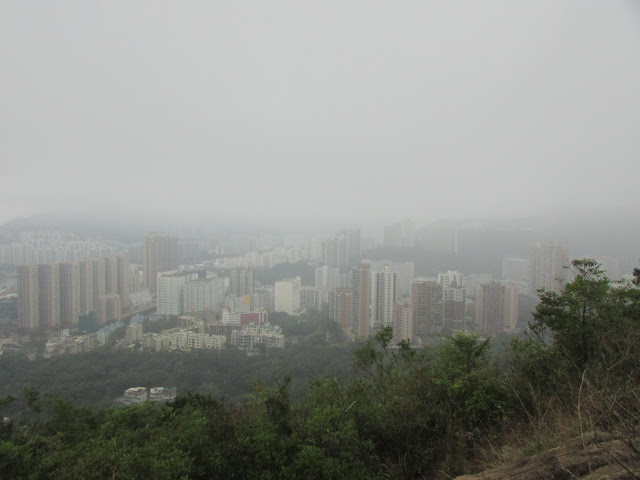 由大學站出發,穿過大埔公路、麗坪路、雍坪徑、九肚山路、馬樂徑後上狗肚山,沿途都屬九肚山巒的豪宅區。上山途中以樹林地帶為主,只有少部分位置可享火炭及沙田新市鎮的景觀。沿途路邊植物的積水相當多,褲管很快被弄至濕透,還以為幾個小時間是否又下了一場不小的雨,快到頂時看到另一小徑有隊標,才知大隊在火炭工業區經南脊上狗肚山。狗肚山頂的標高柱立在一堆巨石上,不過是日沒上巨石堆拍攝,很快就朝北而下,此段小徑斜度雖然不高,可是泥土充滿水分下變得濕滑非常,要非常小心及細步地下降,旁邊有樹就盡量扶樹。