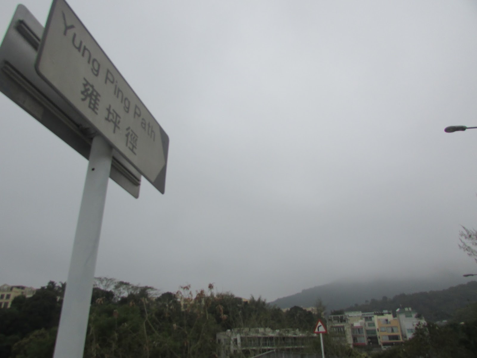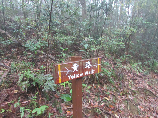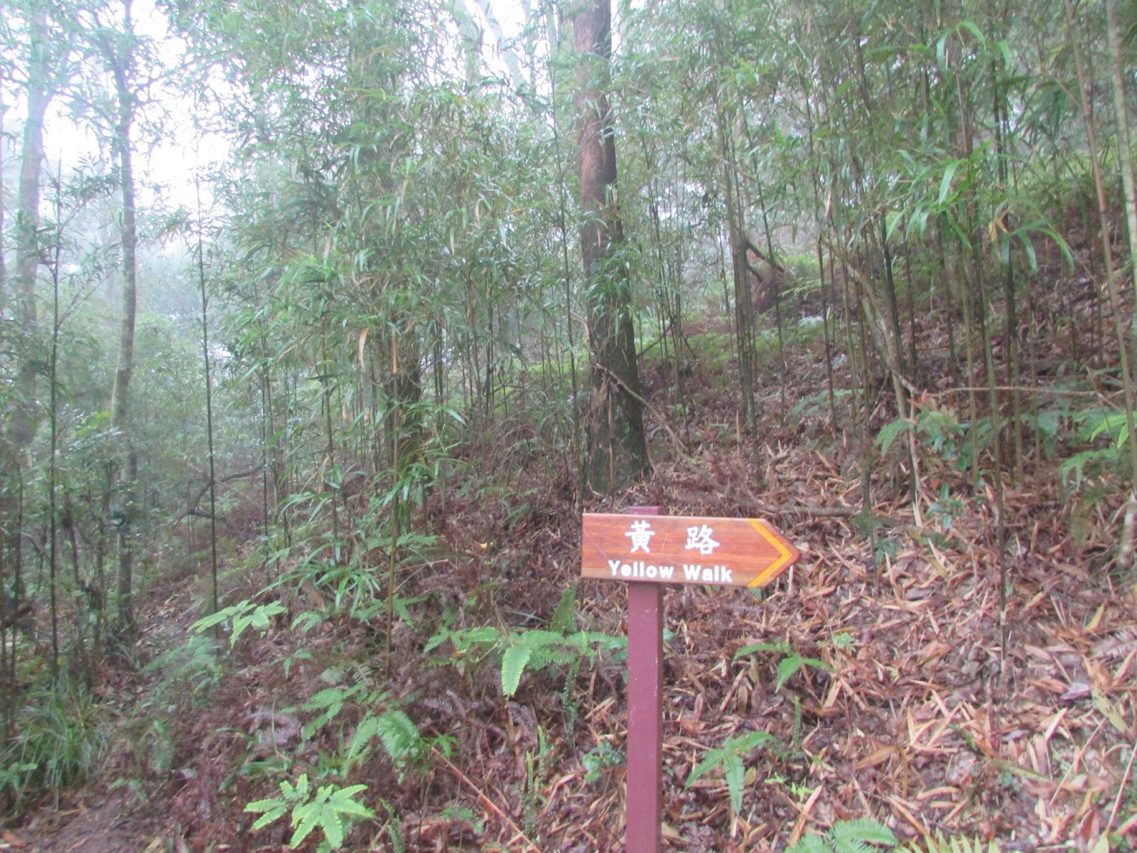 此時海拔又回到三百米水平,所以眼前景色又像仙境般,層雲中的微雨都使樹林裡發出陣陣淅瀝聲。在平緩的黃路走,初段仍是一段竹林,途中亦可聽到山下工地施工時的打樁聲,半小時後為落乾坑的小徑入口。中段的泥土亦因充滿水分而相當濕滑,而且斜度較狗肚山下山時更高,旁邊又無樹木作扶手,因沒有安全的踏腳位,只能坐著慢慢而下,很快的弄至臀部及滿手都是泥漿。繼續在密林中穿梭而下,臨到大埔公路時是個墓地(但路況不太明顯),由黃路至大埔公路,需時約大半小時。