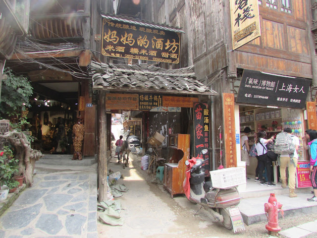 十分鐘後沿車回大街,在街上漫步,細賞苗家的建築及店鋪特色,街巷深處還有忙於修建的吊腳樓,沿途間中看見騾子搬磚,無疑產生幾分同感,在香城兩者角色更應掉換,大多數人都是一頭頭騾子,終日為他人服務,直至上年紀為止,不少動物隨時過得比人還要幸福。