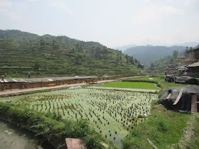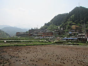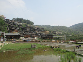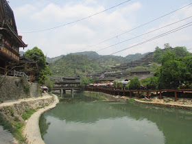 看過苗家建築過後,就沿標示去田野,近距離欣賞農田和梯田風光,時值春季,有些苗家婦女穿著水鞋,陷進田中泥沼插秧,亦有婦女在梯田間穿梭,幾個月後將是苗家人的光景。田園風光總教人舒服,煩惱都會無形中拋諸腦後,有遊客在江邊寫生,亦有充滿童真的孩子在江邊嬉戲,童真這兩個字對香城社會來說是不存在的,大多數孩子自細就被培養出長輩間分享榮耀及創造廿年願景的工具。直落江邊,再踩石級過對岸,體驗一下在境外遠足的感覺,再快速回苗寨。到苗寨時離十二點午飯時間只餘六分鐘,就繼續以極快步速走至餐廳。
