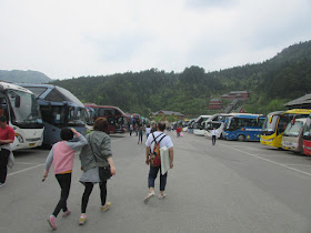 到景區停車場時可見旅遊巴極多,使坳仔有點驚訝,不過位置偏遠,離最近的凱里市區車程也需一小時,心想不太可能一大早就有很多團隊參觀,大型團隊也難以入住景區客棧,最多也是門口附近的幾家酒店及旅館,才知原來停車場同屬汽車站,結果坳仔推測果然沒錯,場內明顯沒想像中多人。由停車場上一段樓梯至北門廣場外圍,導遊在買票過後先為眾團友大合照,再進場換乘環保車,三分鐘車程到苗寨。