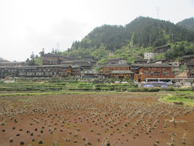 看過苗家建築過後,就沿標示去田野,近距離欣賞農田和梯田風光,時值春季,有些苗家婦女穿著水鞋,陷進田中泥沼插秧,亦有婦女在梯田間穿梭,幾個月後將是苗家人的光景。田園風光總教人舒服,煩惱都會無形中拋諸腦後,有遊客在江邊寫生,亦有充滿童真的孩子在江邊嬉戲,童真這兩個字對香城社會來說是不存在的,大多數孩子自細就被培養出長輩間分享榮耀及創造廿年願景的工具。直落江邊,再踩石級過對岸,體驗一下在境外遠足的感覺,再快速回苗寨。到苗寨時離十二點午飯時間只餘六分鐘,就繼續以極快步速走至餐廳。