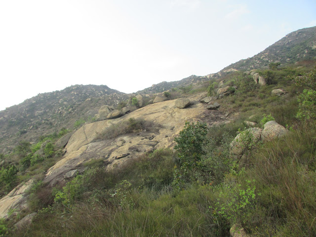 原路返回屯門健身徑,之後繼續在引水道畔馬路南行,旁邊當然有些健身設施。一直南下至M194標距柱對面上山,並尋找「拳頭石」和「孔子石」,當看見「拳頭石」後續上行至「孔子石」時發現斜度越來越高,所以「孔子石」亦無法近觀,接著取道西南脊直上九逕山,途中還可近望「癩蛤蟆石」及「狗仔石」,算是獲得個「幸運獎」。