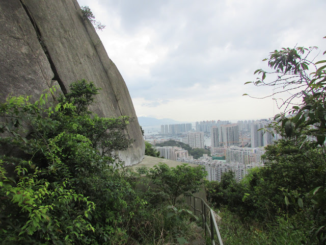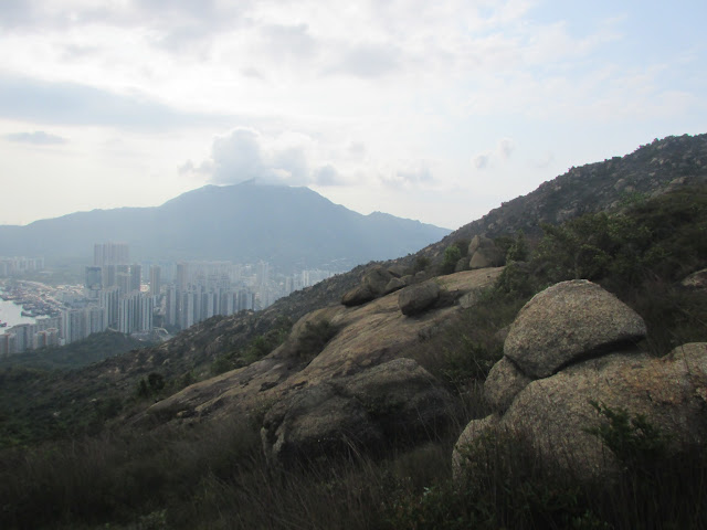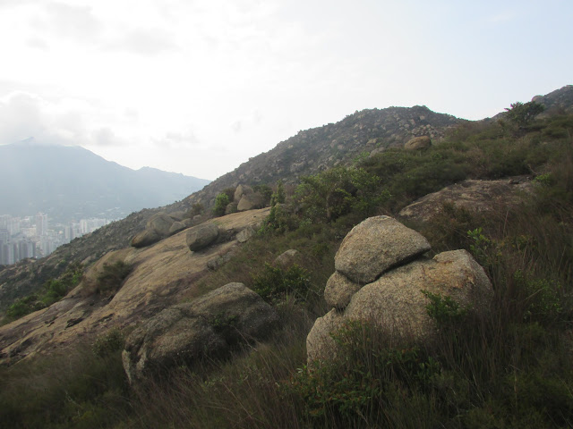 上山途中有不少歧路,路邊間中可見奇石,而且部分的體積還相當大,可是未適應春末的溫度之緣故,加上又處密林,已感到體力消耗得很快,最後在其中一處巨石觀景台上停下休息,欣賞山下屯門新市鎮的風貌,順帶為身體稍為降溫,至於傳說中的「飛來石」就找不著了。