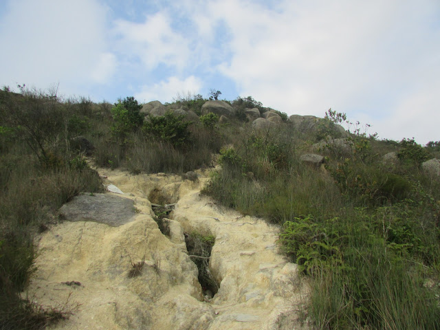 路上有些越野電單車的車轍,其中一段更幾乎垂直而行,真佩服車手的膽量,隨時是比跳樓機更刺激的玩意,那段筆直山徑離「大路」只是幾步之距,假若一下興奮過頭,然後一步踏空,飛墮至幾十米下的谷底,可能要提早「升仙」了。